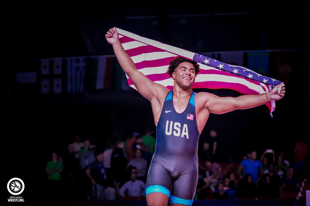 Gable STEVESON (USA) carries the American flag after winning the 2017 junior world title. (Photo by Marion Stein)