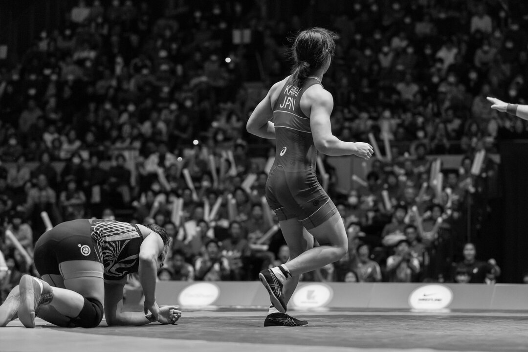 (Photo: (Photo : Kawai célèbre sa victoire sur la Chine en finale de la Coupe du Monde de Lutte Féminine, par Max Rose-Fyne)